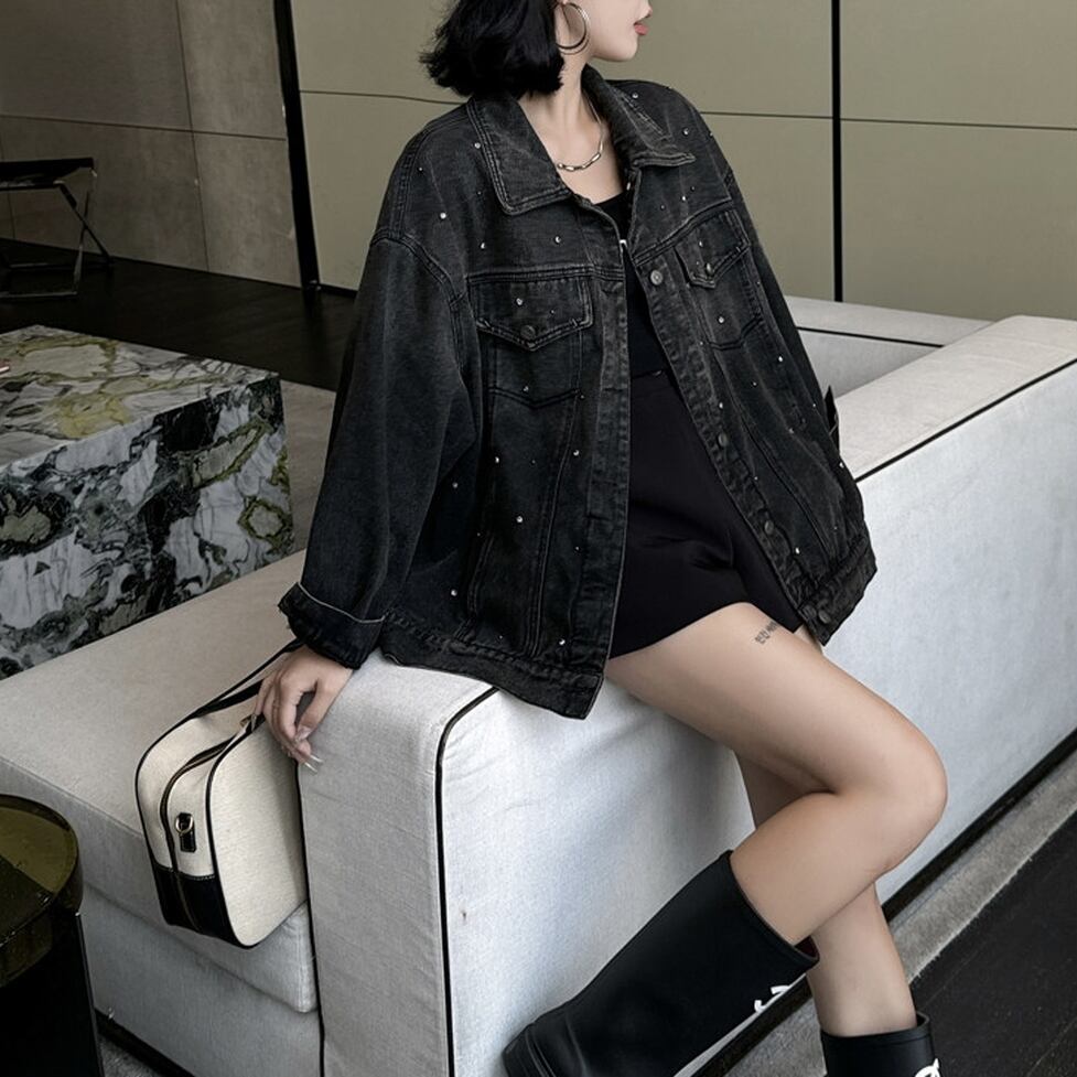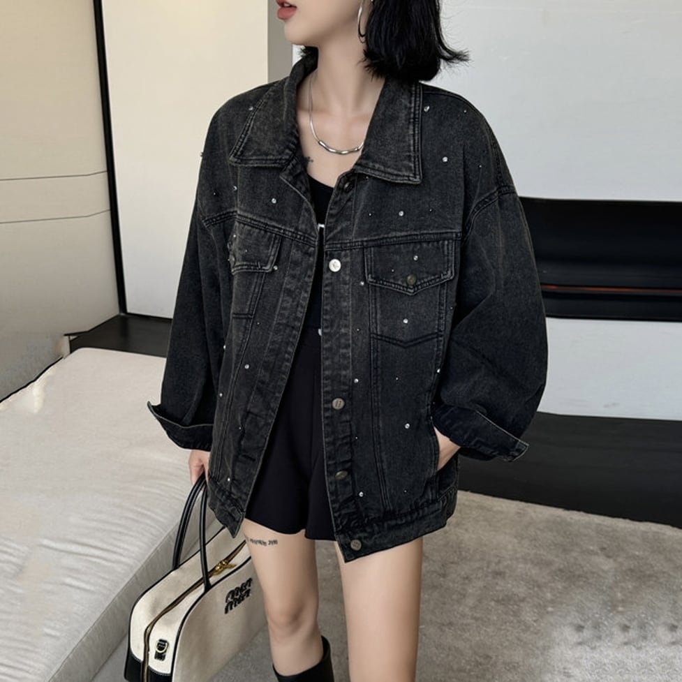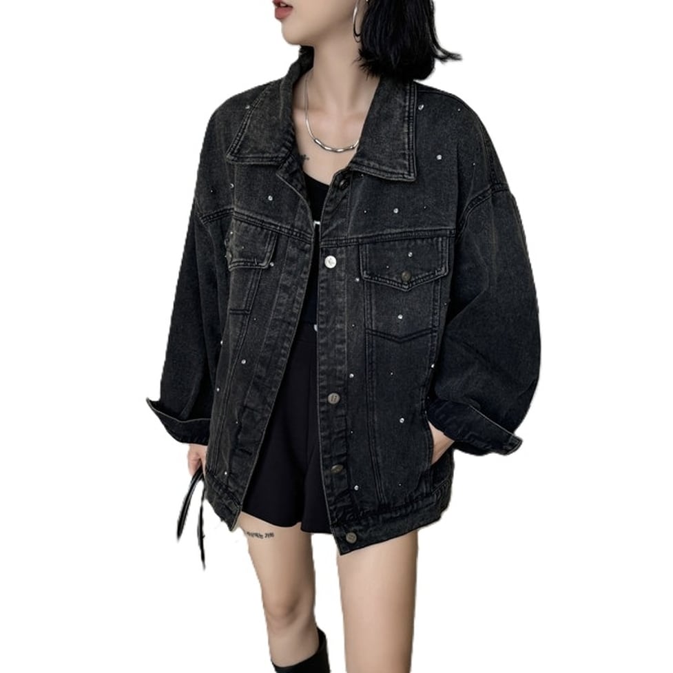 ゆったりしたシルエットのデニムジャケット。散りばめられたストーンが女性らしい華やかさをプラス。カジュアルなこなれ感を演出してくれるのも嬉しいポイントです。