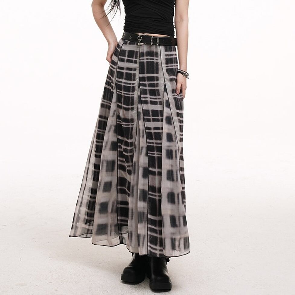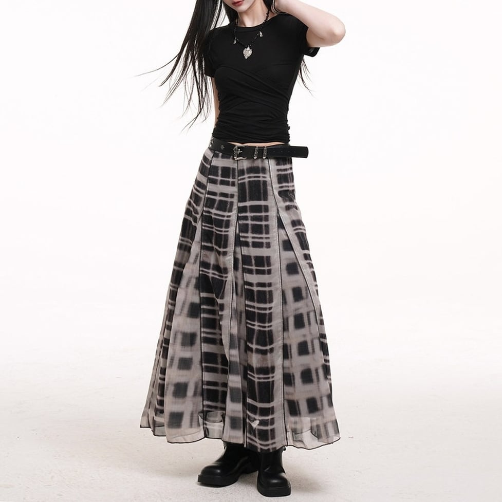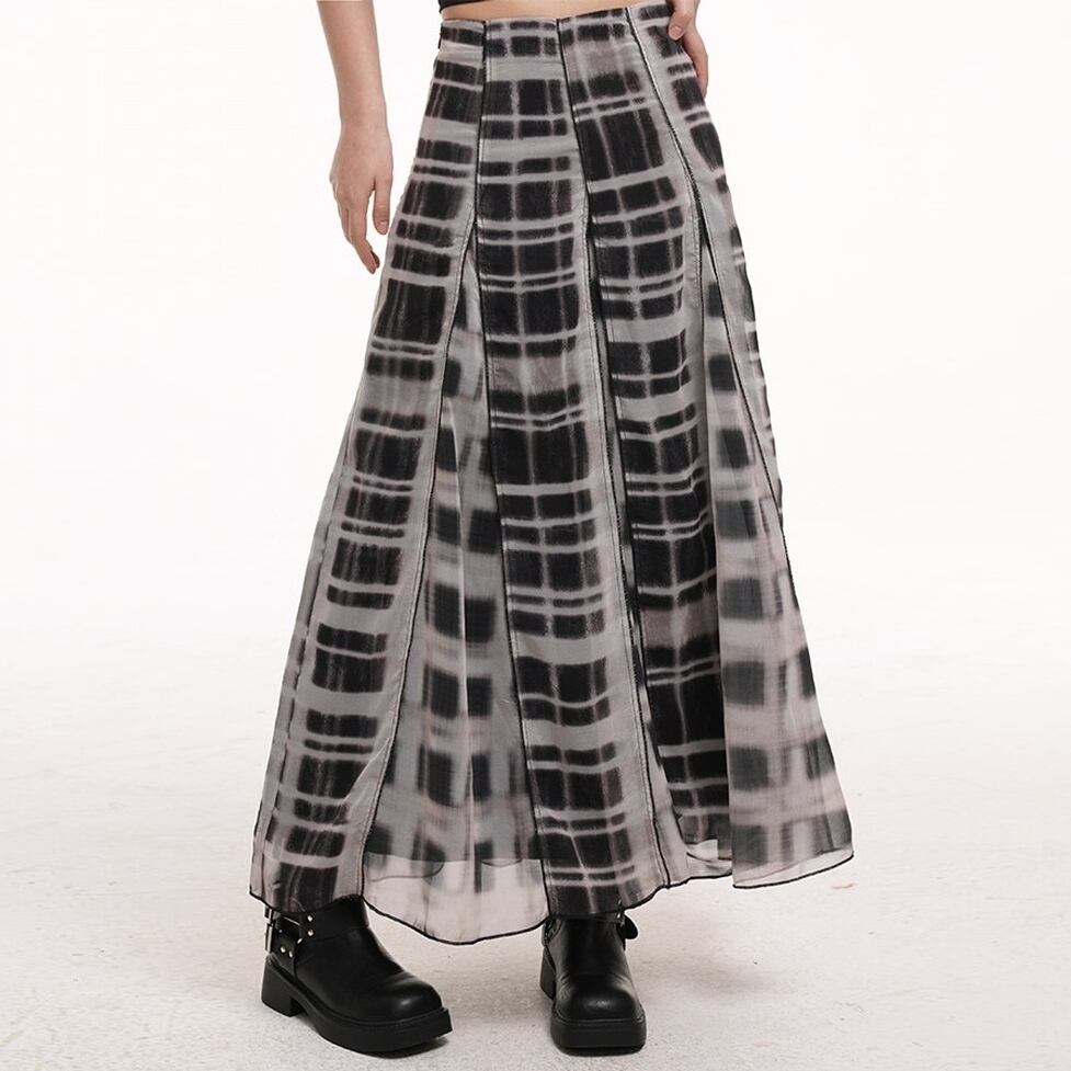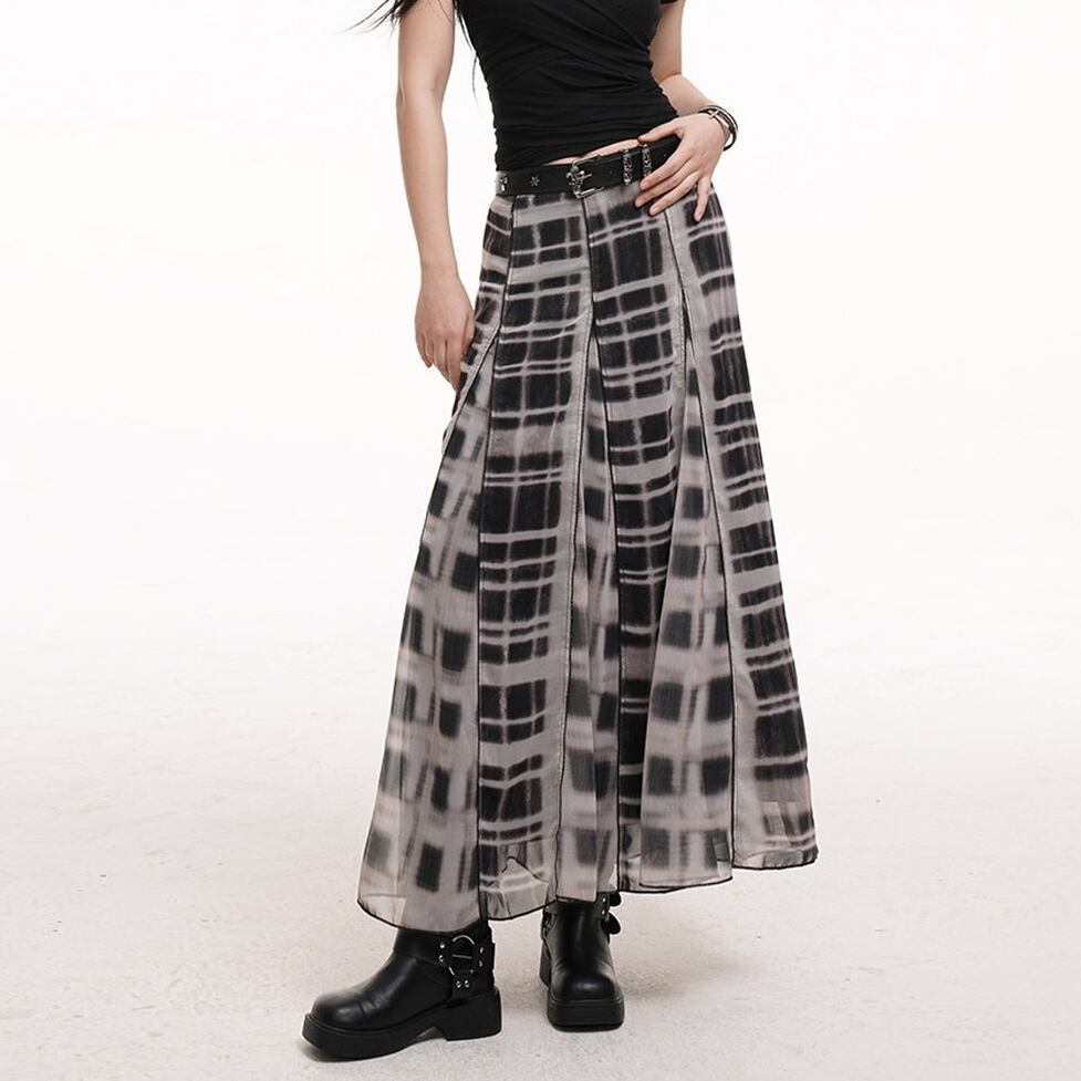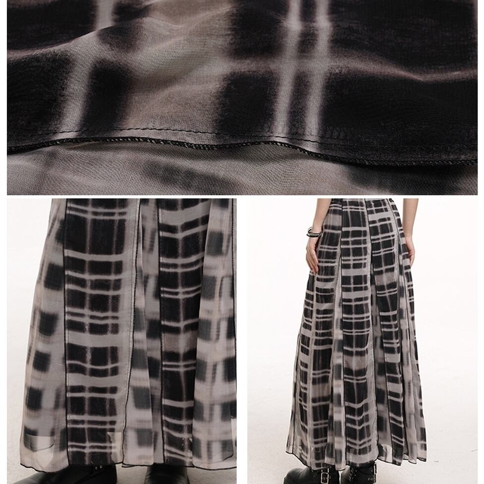 ニュアンスのあるアートチェックが印象的なシアーワイドパンツ。