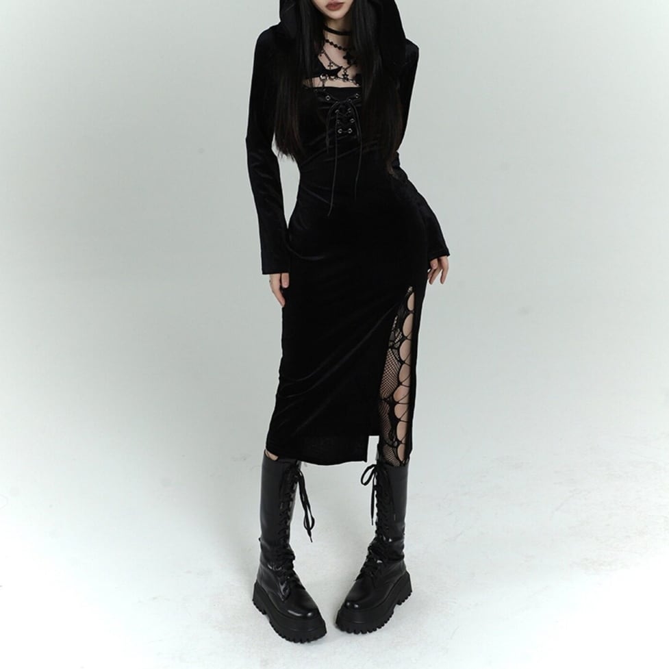 フード付きトップスとキャミワンピースのレイヤードセット。