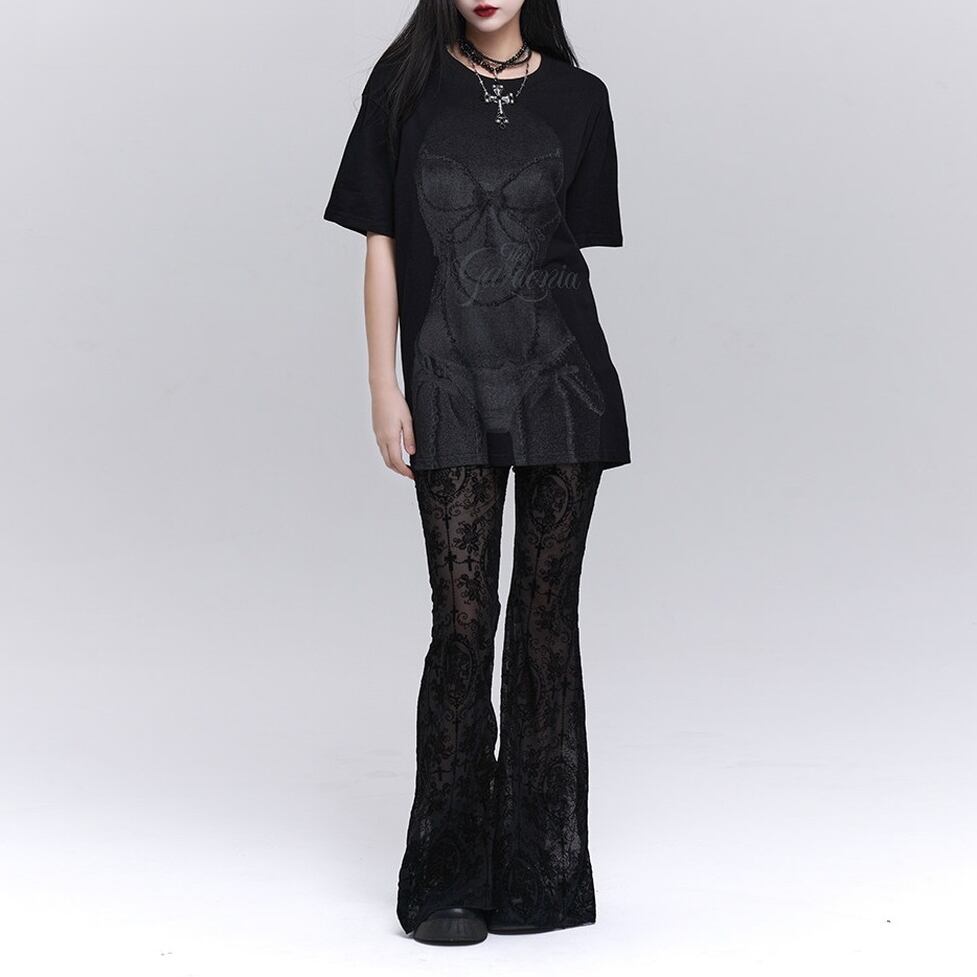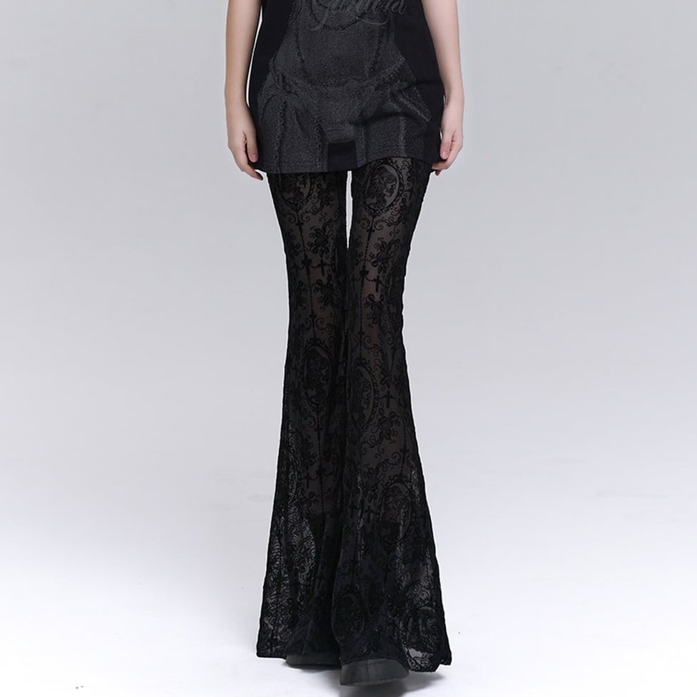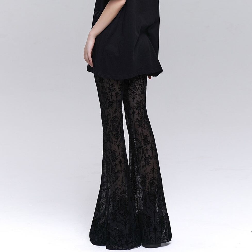 繊細なレースが全体に施された、存在感のあるフレアパンツ。