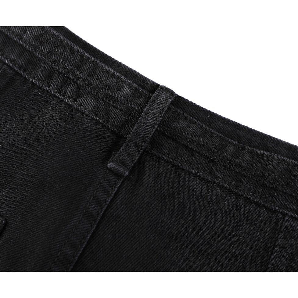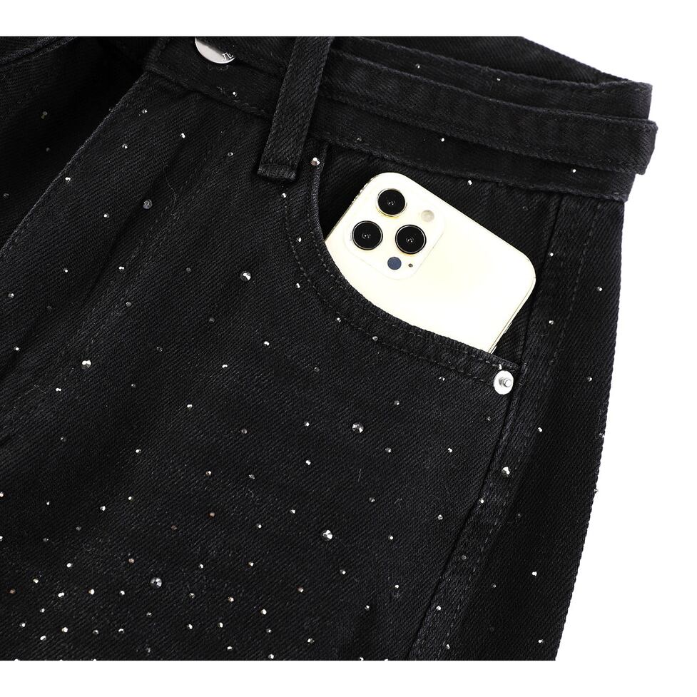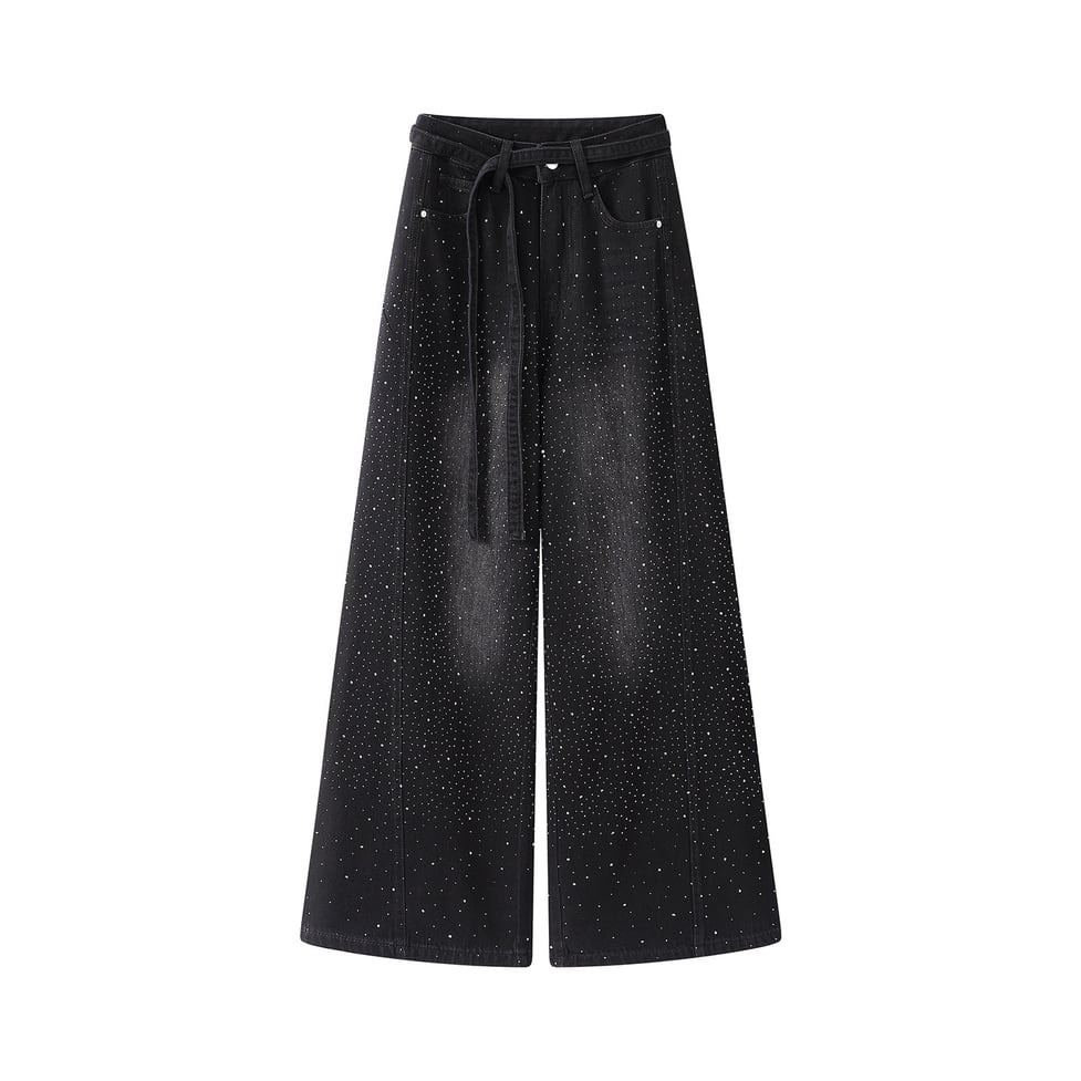 ラインストーンの輝きが目を引くワイドデニムパンツ。