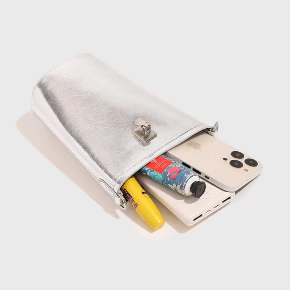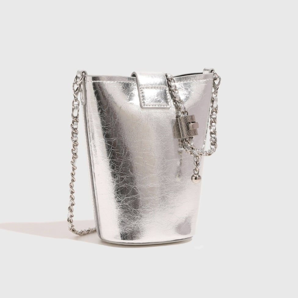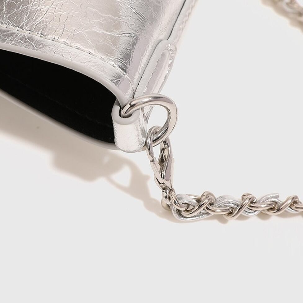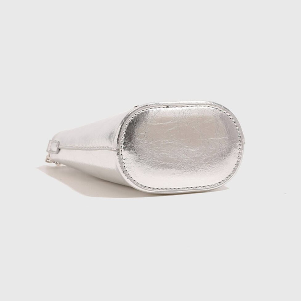 メタリックな光沢を放つ質感が、ミニマルなバケツ型シルエットにエッジを効かせます。