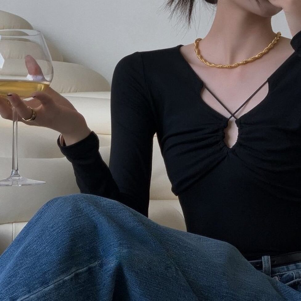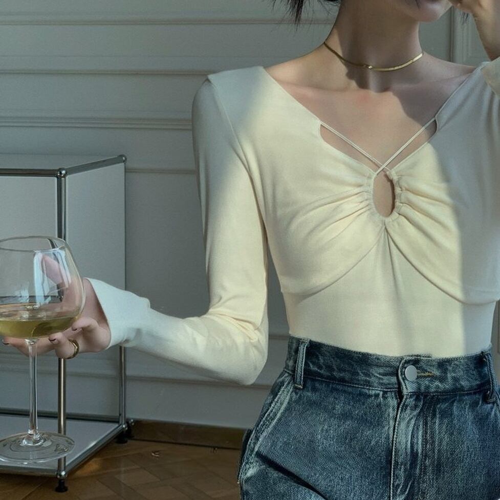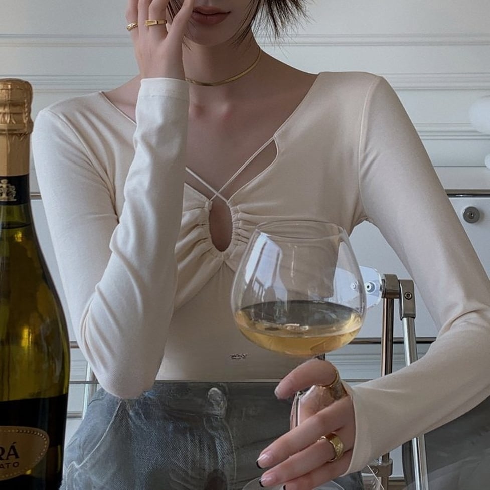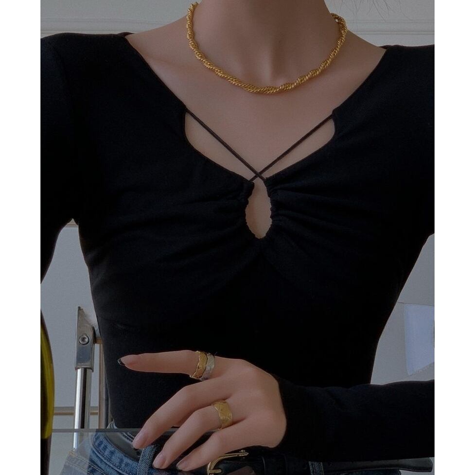 胸元のカッティングをクロスストラップで繋ぎ、ギャザーを寄せたフロントデザインがアクセントのカットソー。
