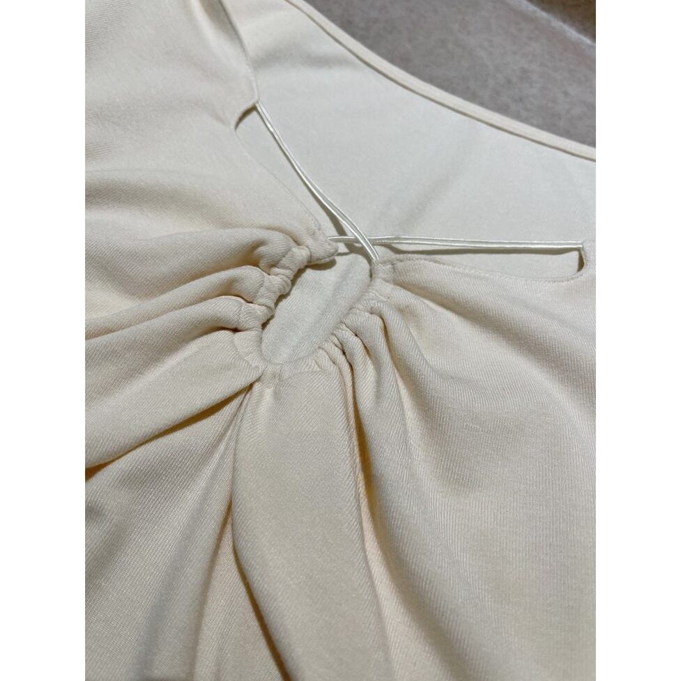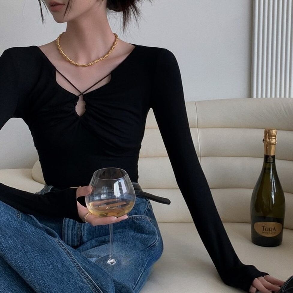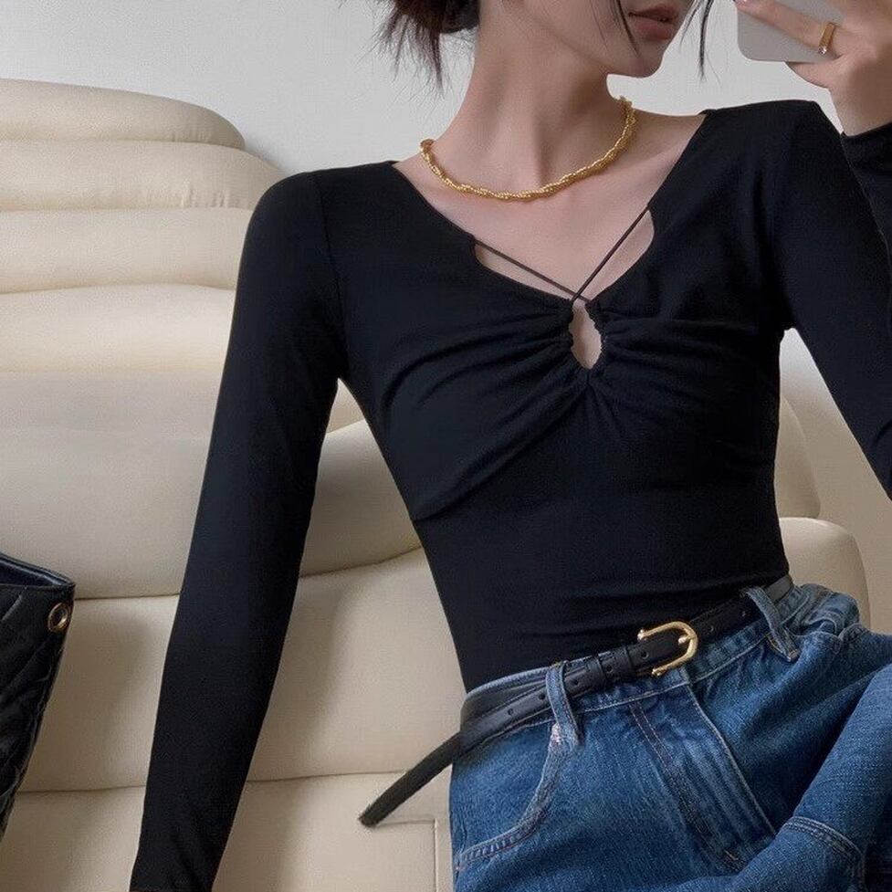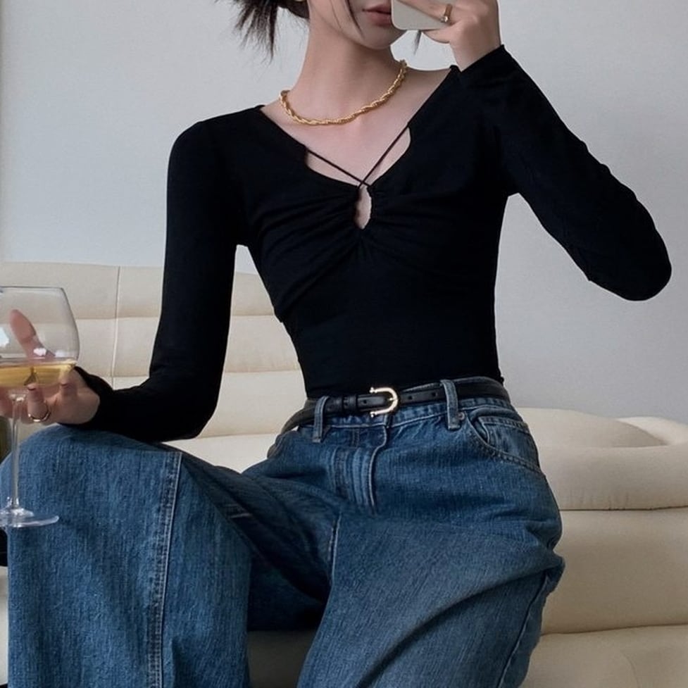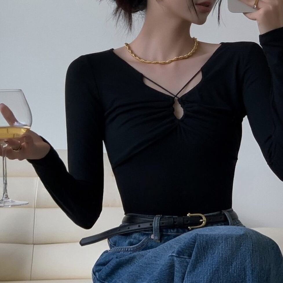 胸元のカッティングをクロスストラップで繋ぎ、ギャザーを寄せたフロントデザインがアクセントのカットソー。