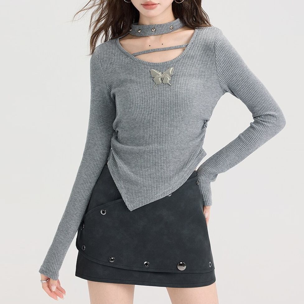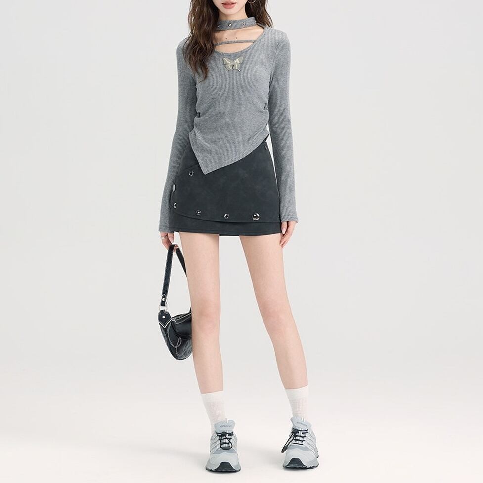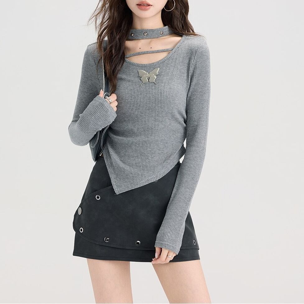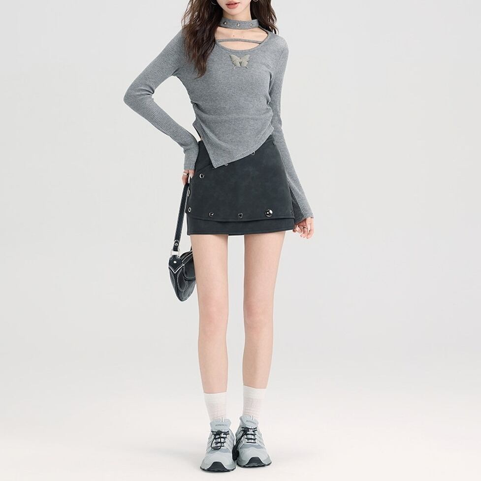 デコルテに抜けをつくるストラップデザインと、さりげないバタフリーモチーフが印象的なリブトップス。
