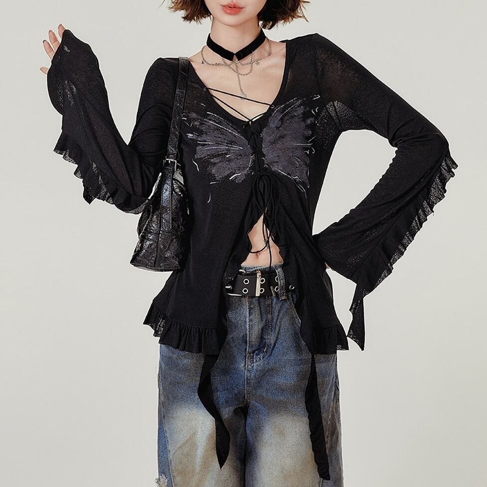 バタフリープリントが印象的な、キャミとトップスの2点セット。