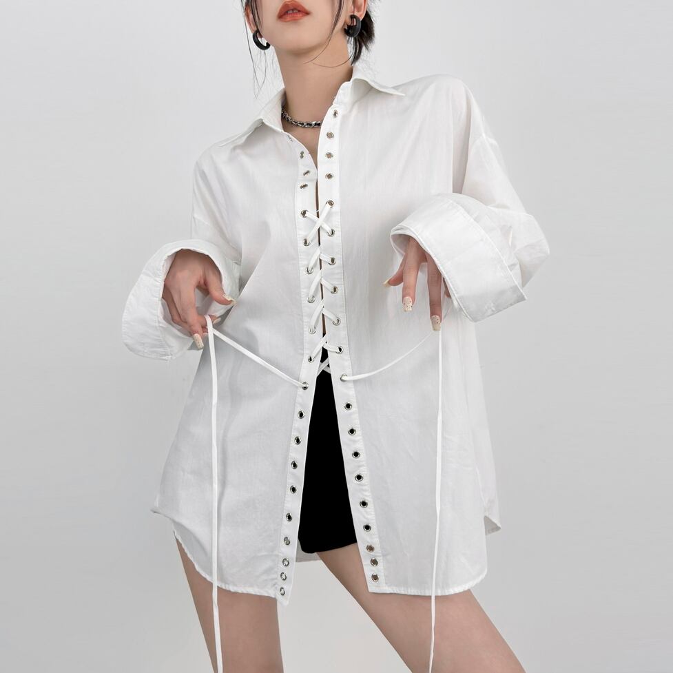 フロントのレースアップが視線を惹きつける、モードなブラックロングシャツ。