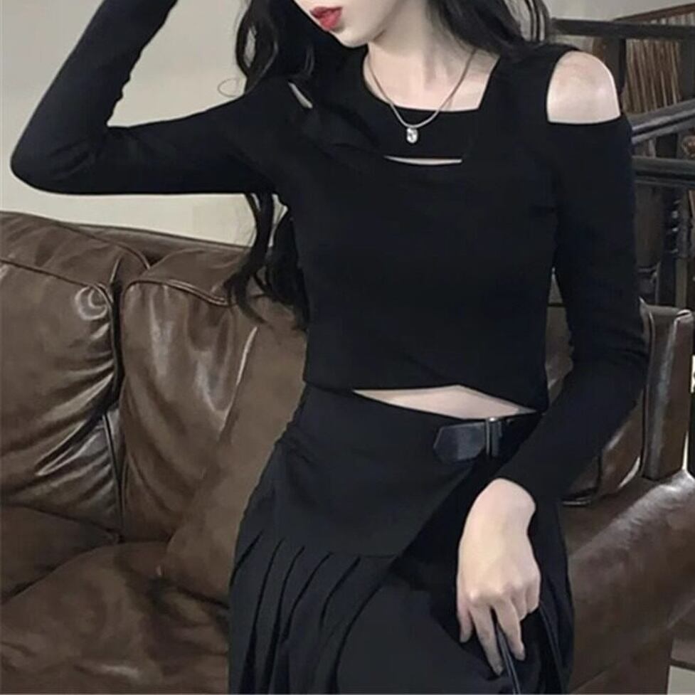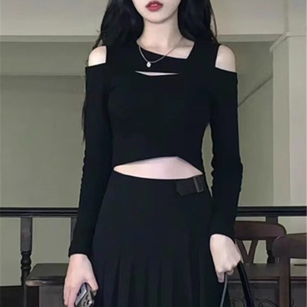 程よい肌見せで抜け感をプラスしつつ、ブラックコーデをより洗練された印象に。