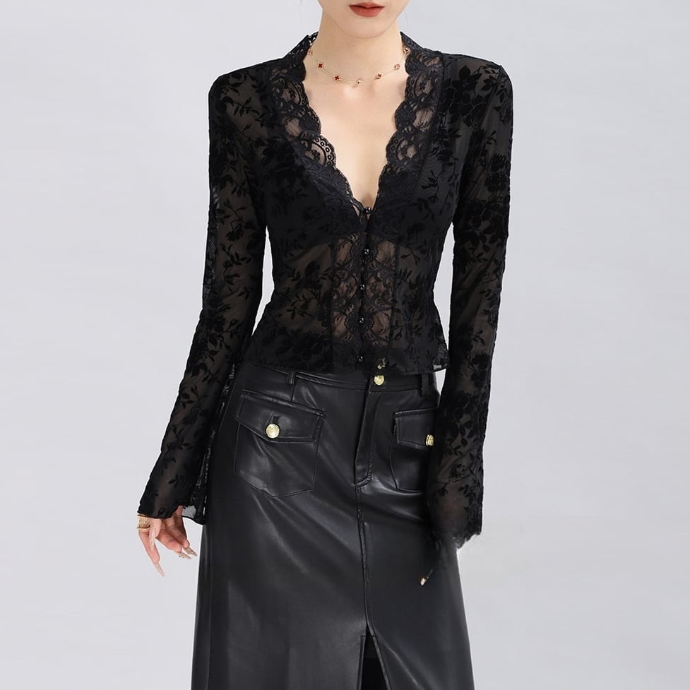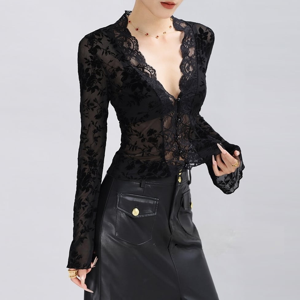 程よい透け感でブラックコーデに女性らしい抜け感をプラス。