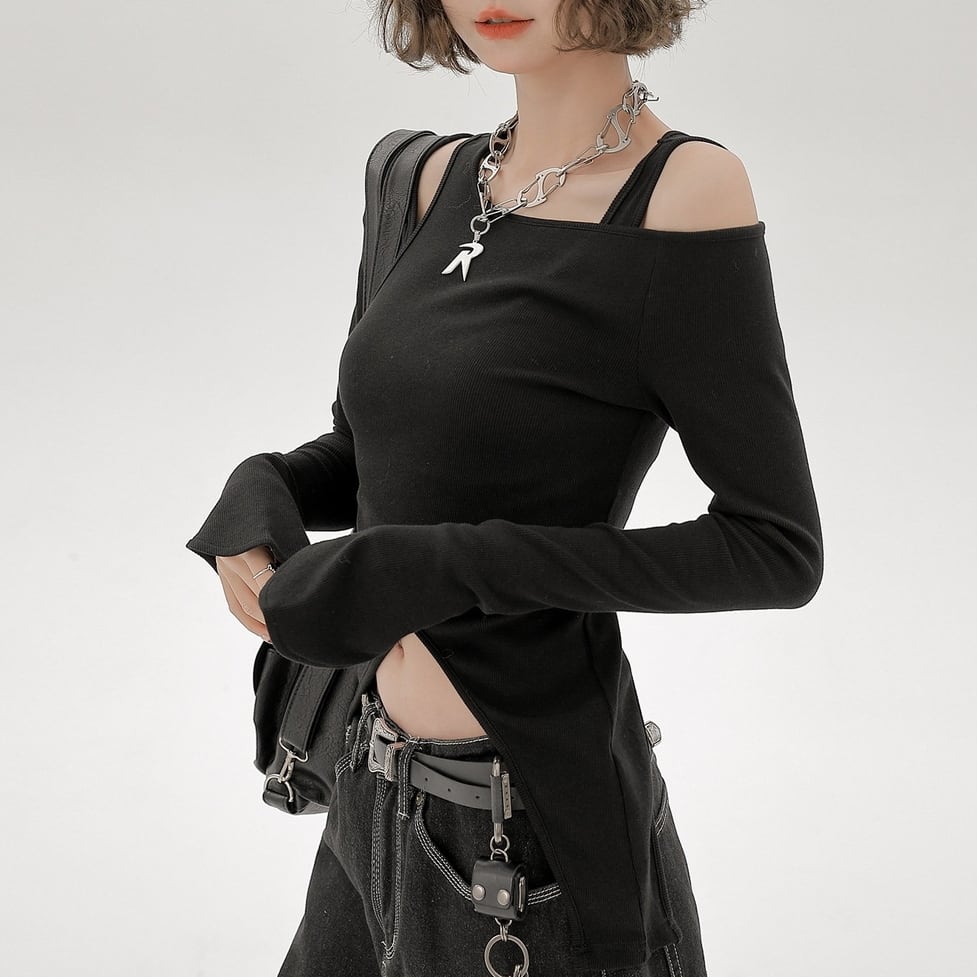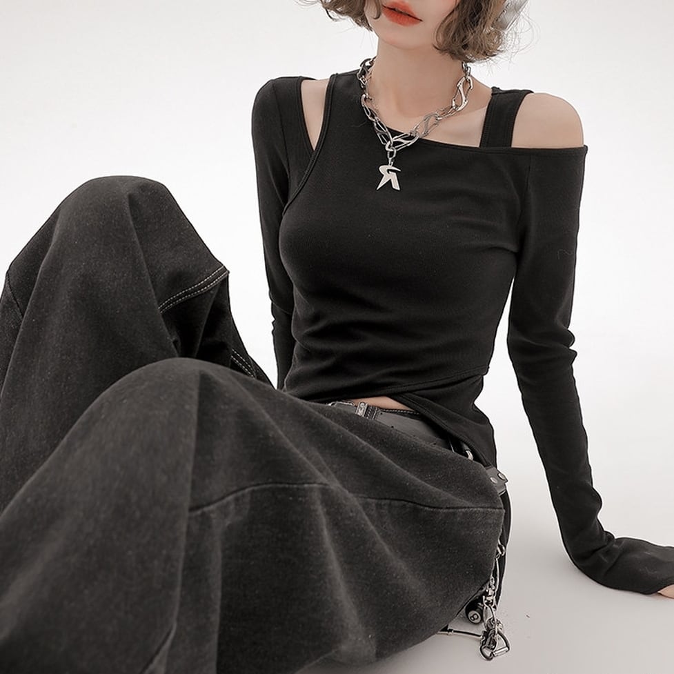 程よい肌見せとレイヤード風ディテールで、ブラックコーデに抜け感をプラス。