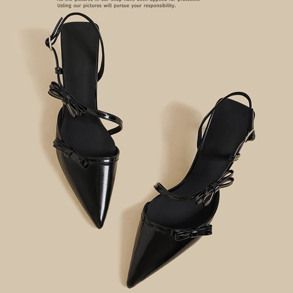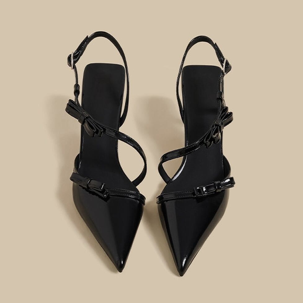 華奢なストラップに小ぶりなリボンをあしらった、程よい甘さのあるデザインパンプス。