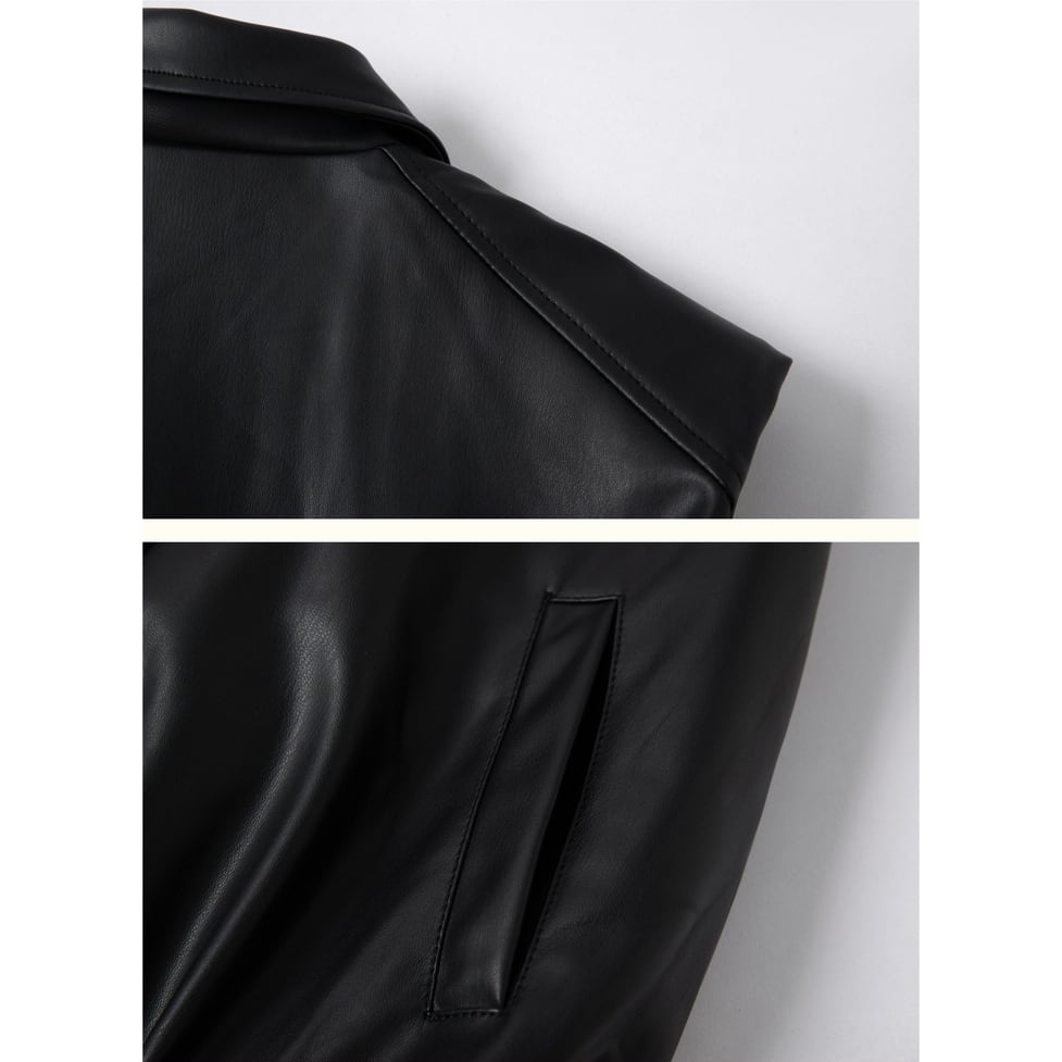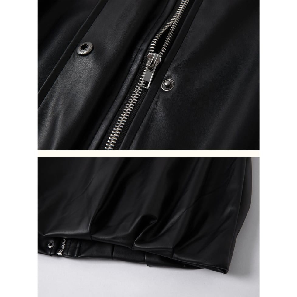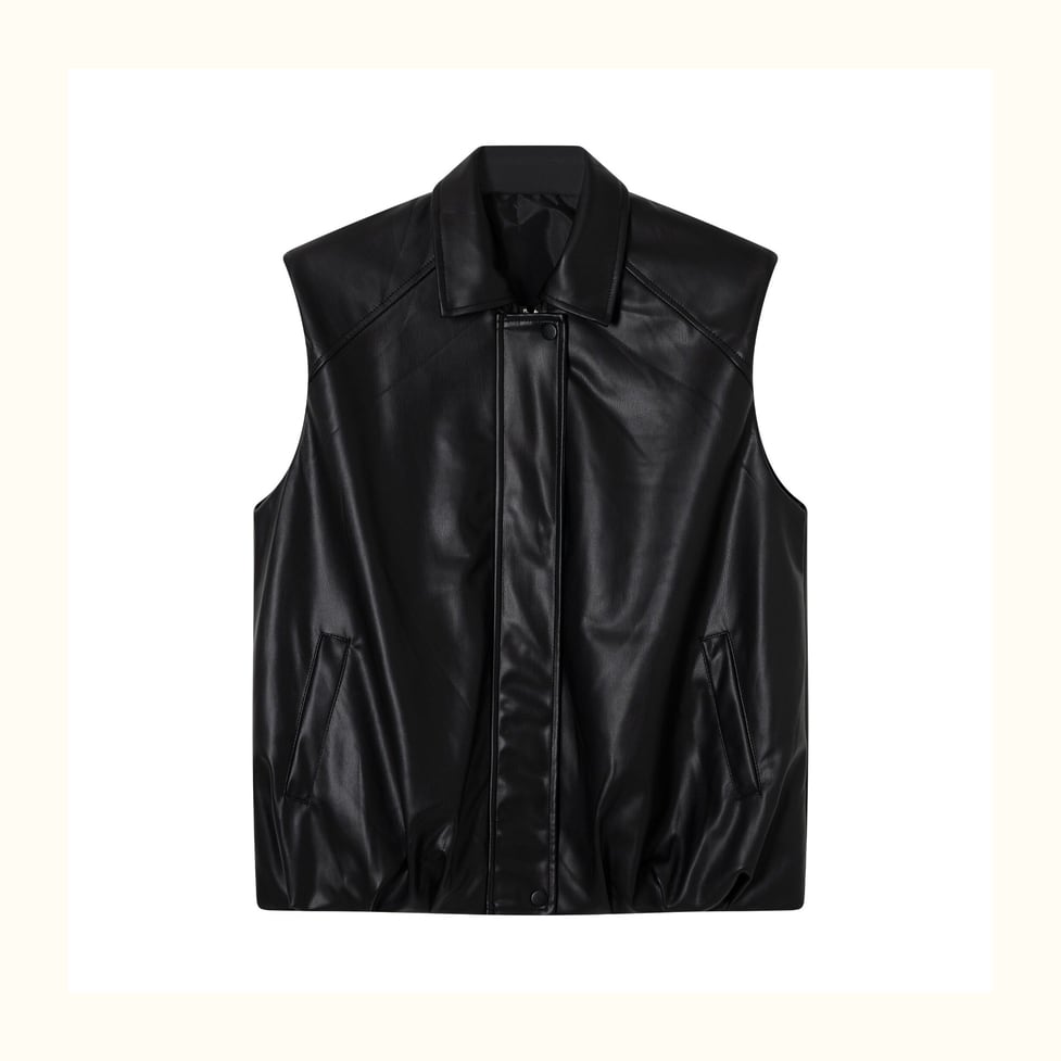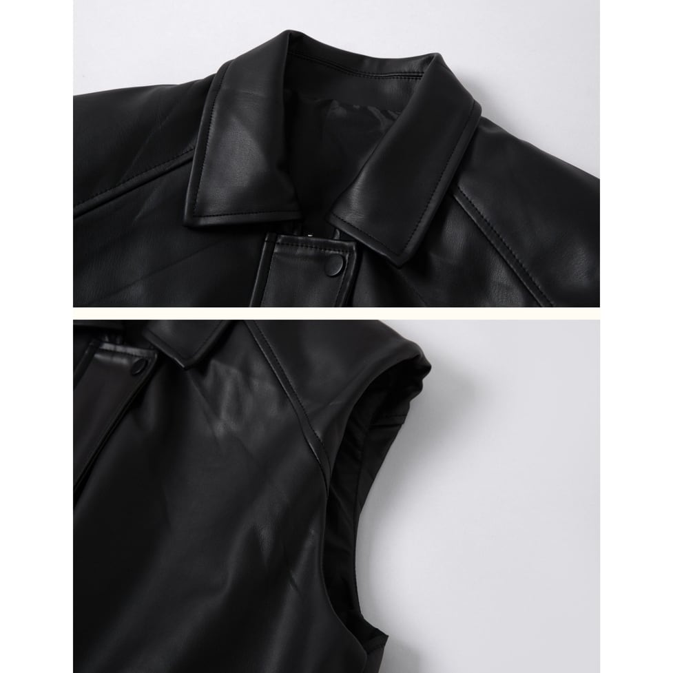 程よいツヤ感が魅力のフェイクレザーを使用した、モードなベスト。
