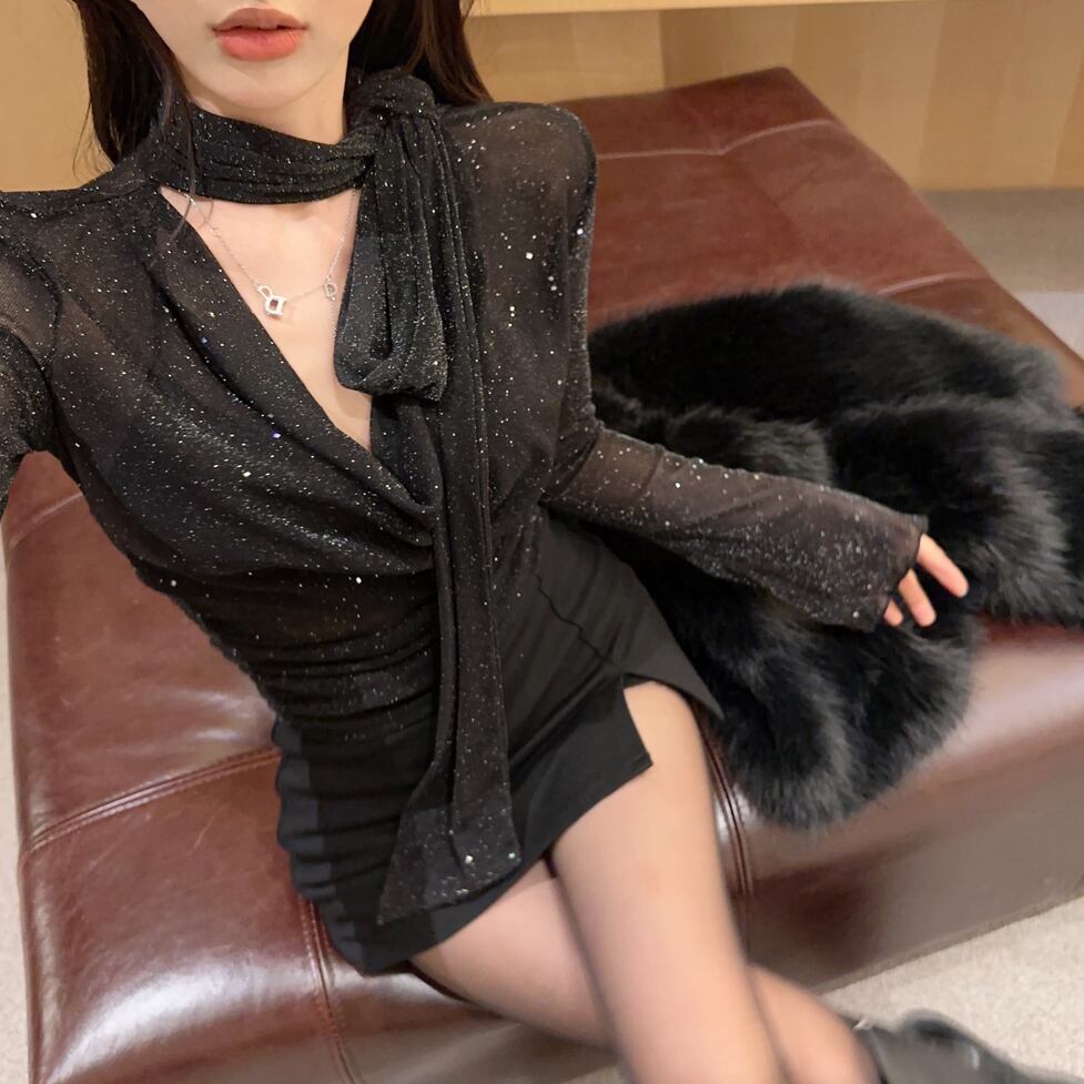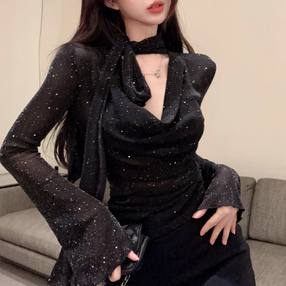 全体に散りばめられたグリッターの煌めきが、ブラックコーデに映える主役級のトップス。