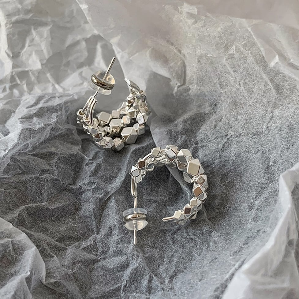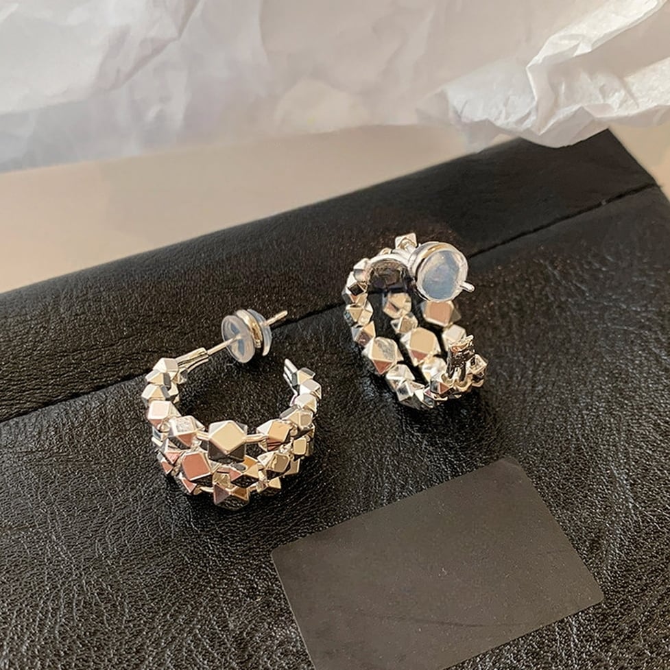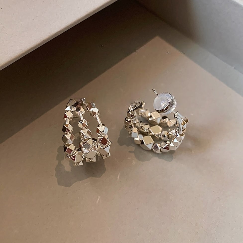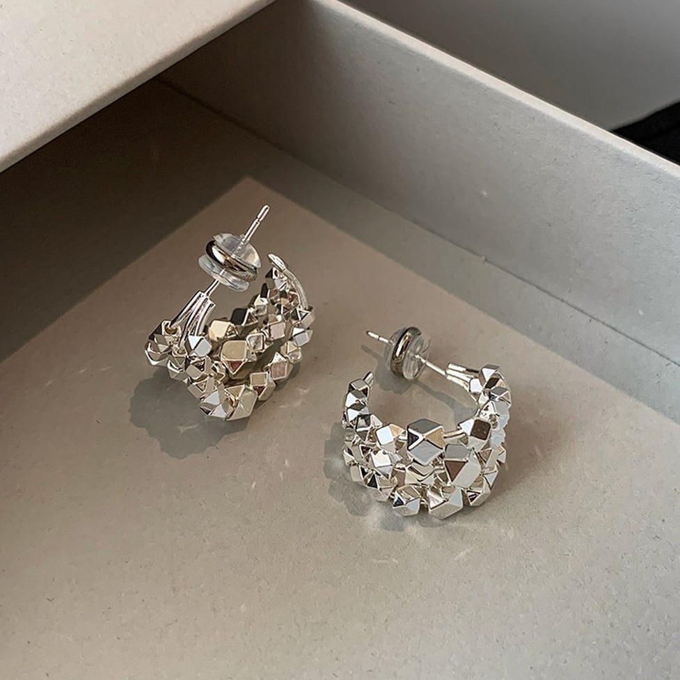 エッジの効いたメタルの質感と、揺れるパールが顔まわりを華やかに彩るピアス。