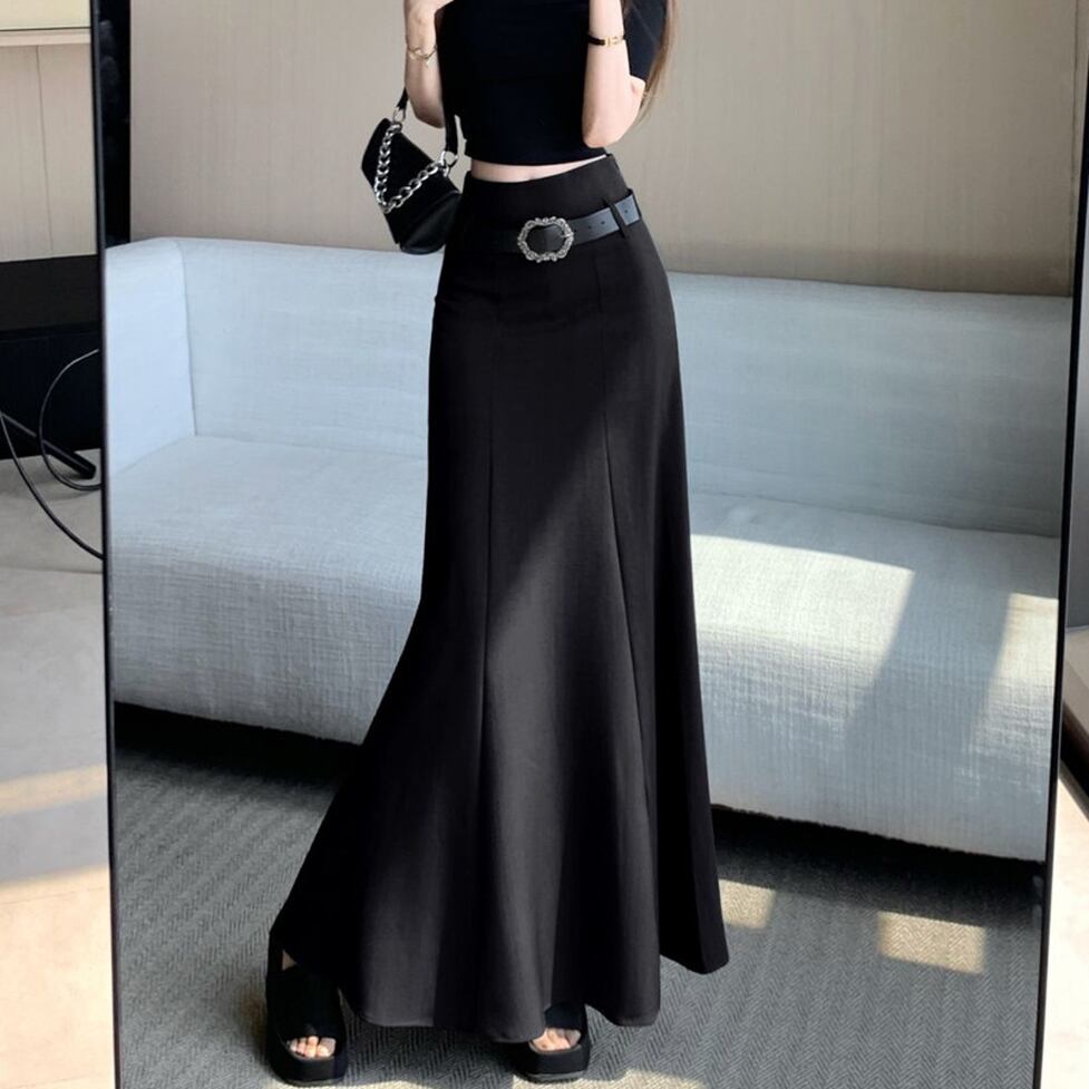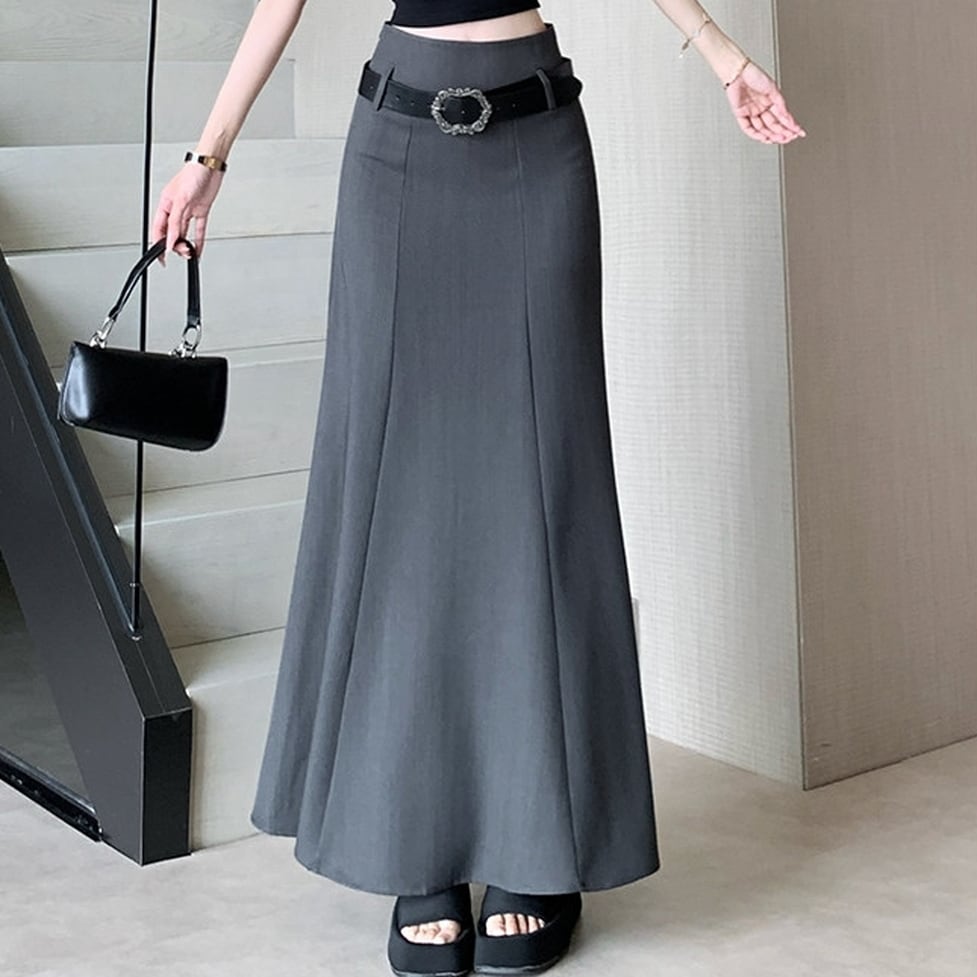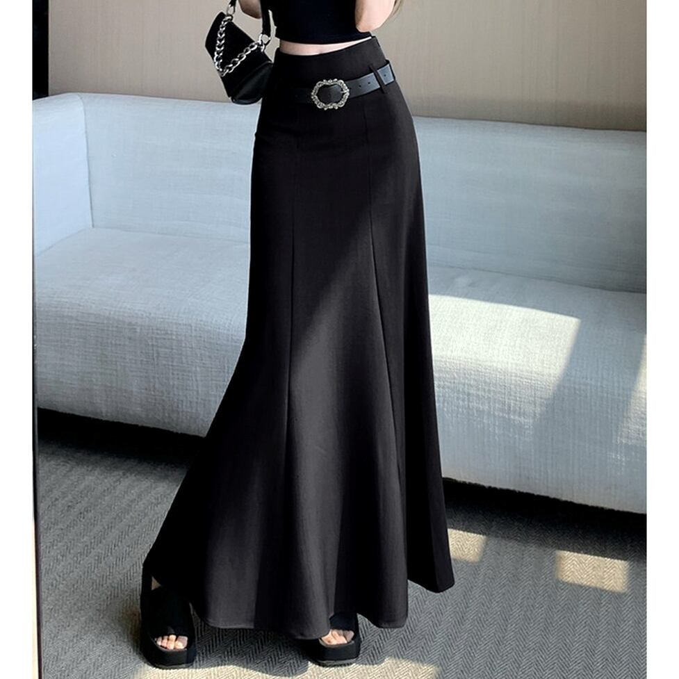存在感のあるバックルベルトがウエストマークを叶える、主役級のマーメイドスカート。