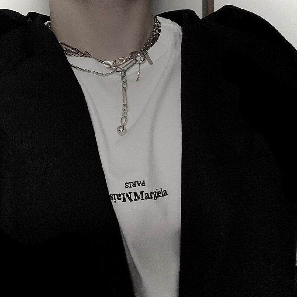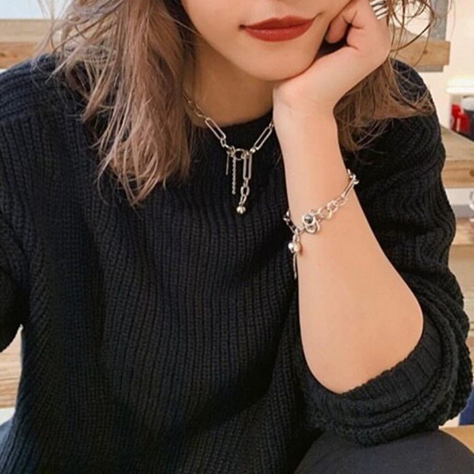 動きに合わせて揺れる細めのチェーンが、首元や手元に縦のラインをつくります。