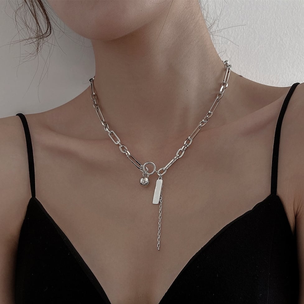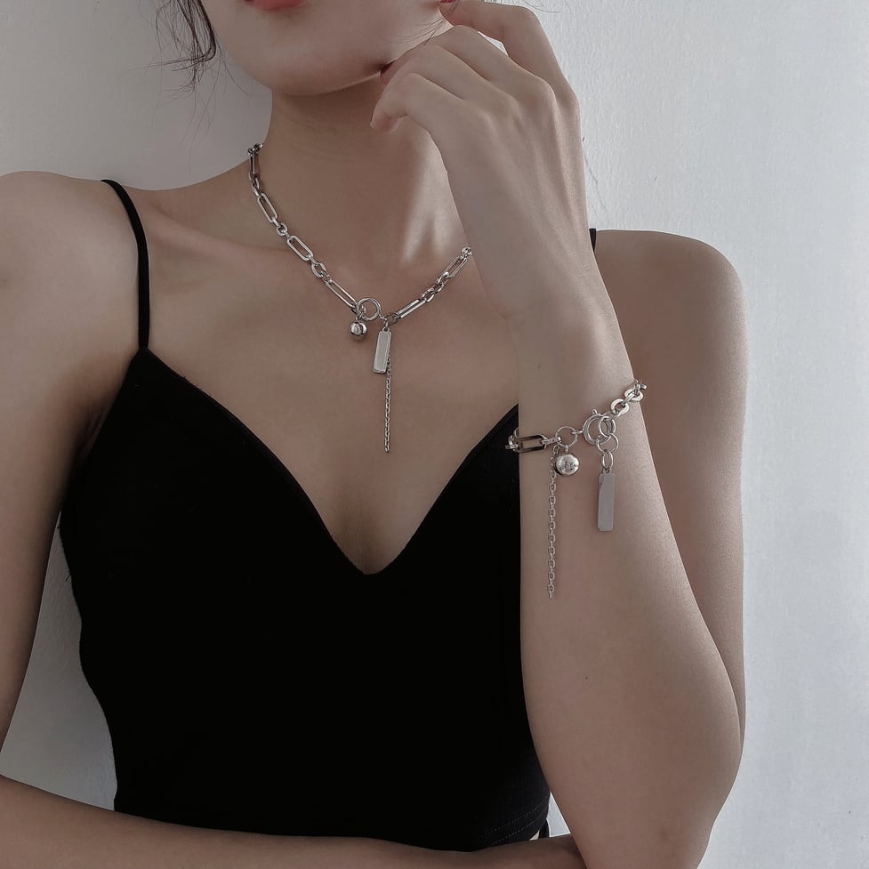 異なるデザインのチェーンに、メタルプレートとボールチャームを組み合わせたアクセサリー。
