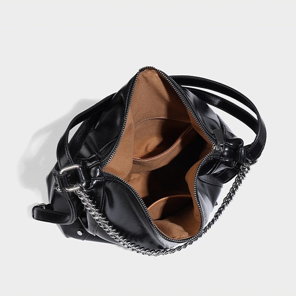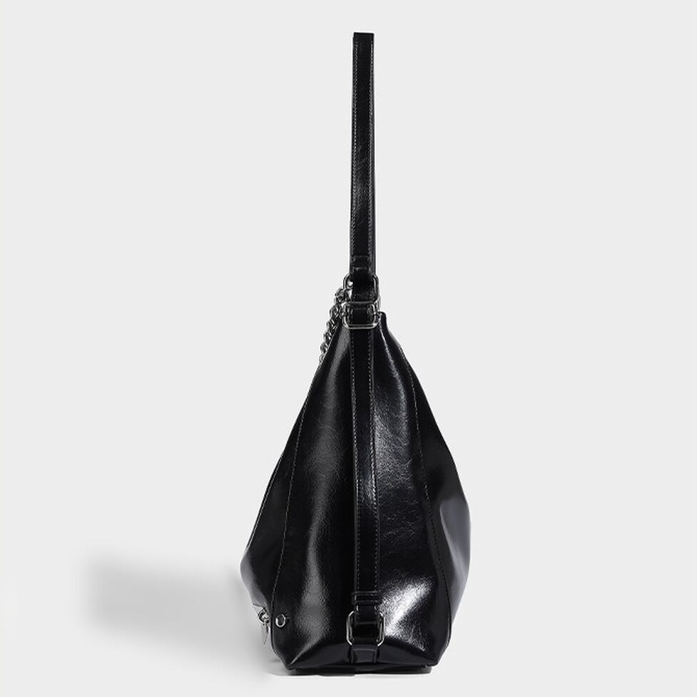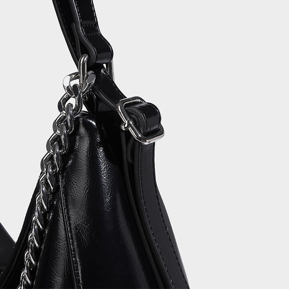 程よいツヤ感が魅力の生地に、チェーンをあしらった主役級のバッグ。