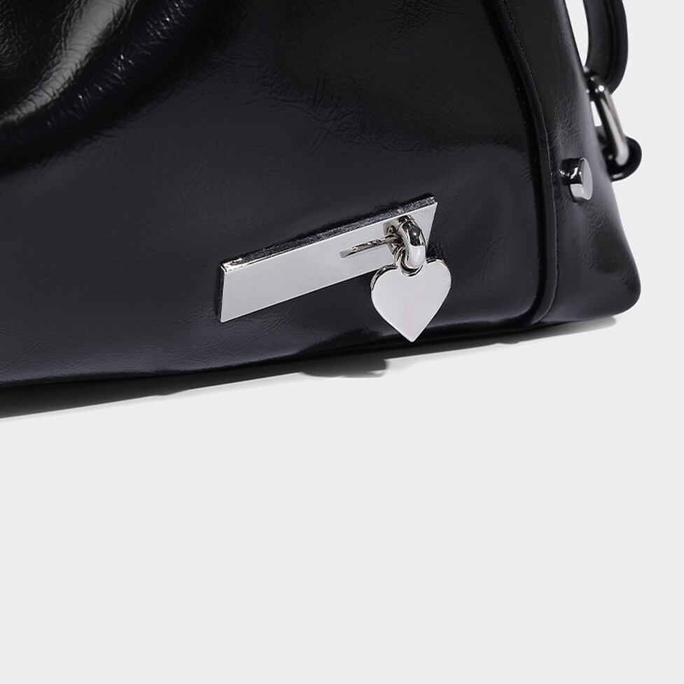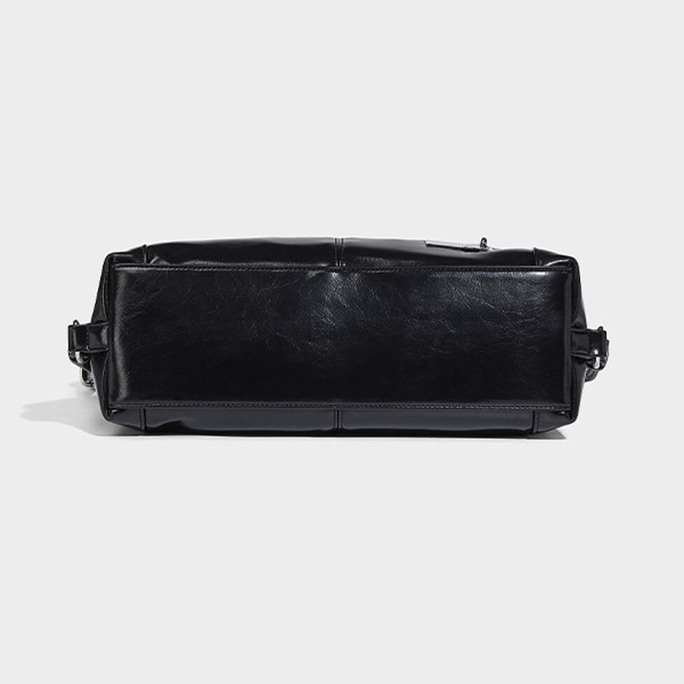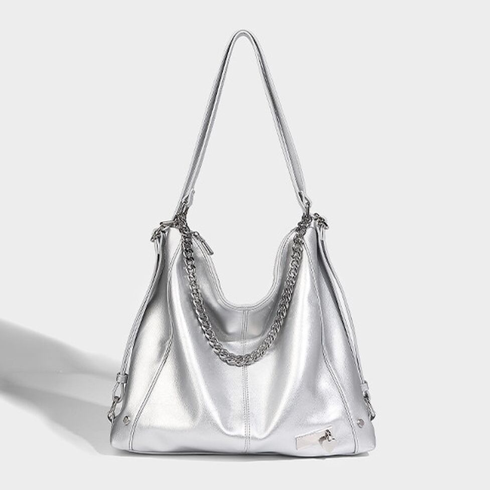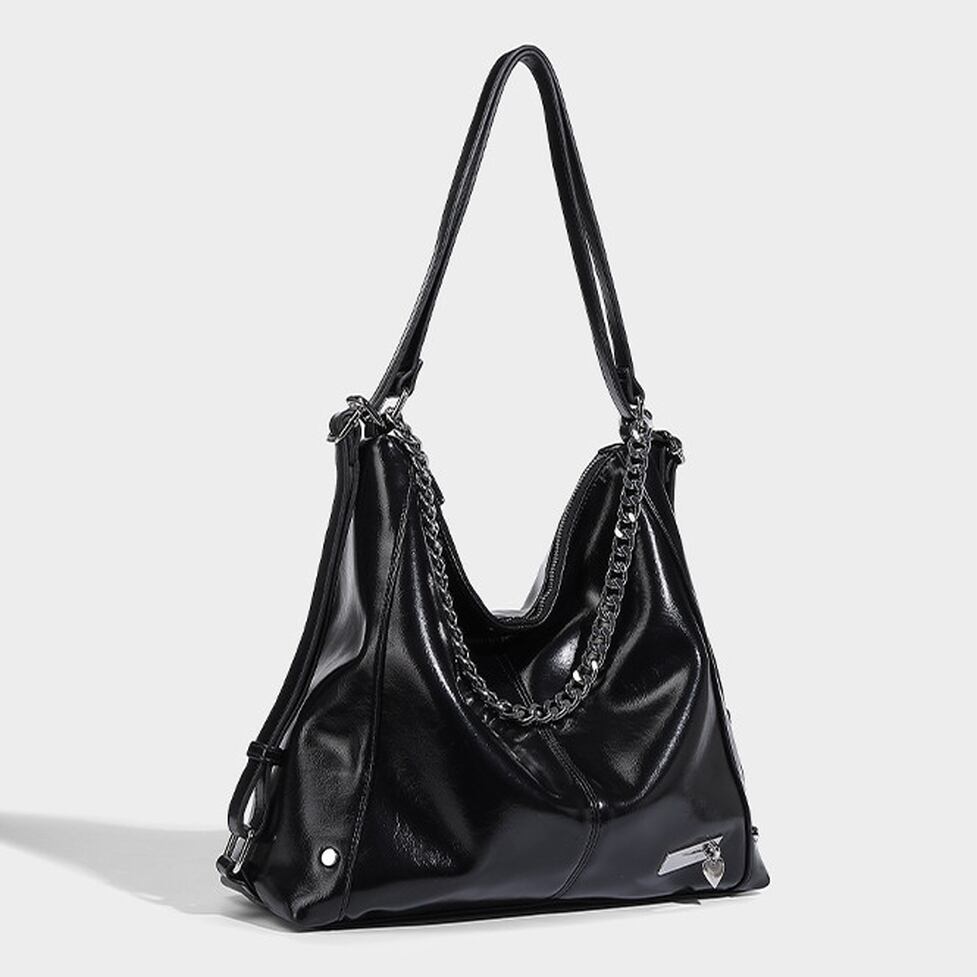 程よいツヤ感が魅力の生地に、チェーンをあしらった主役級のバッグ。