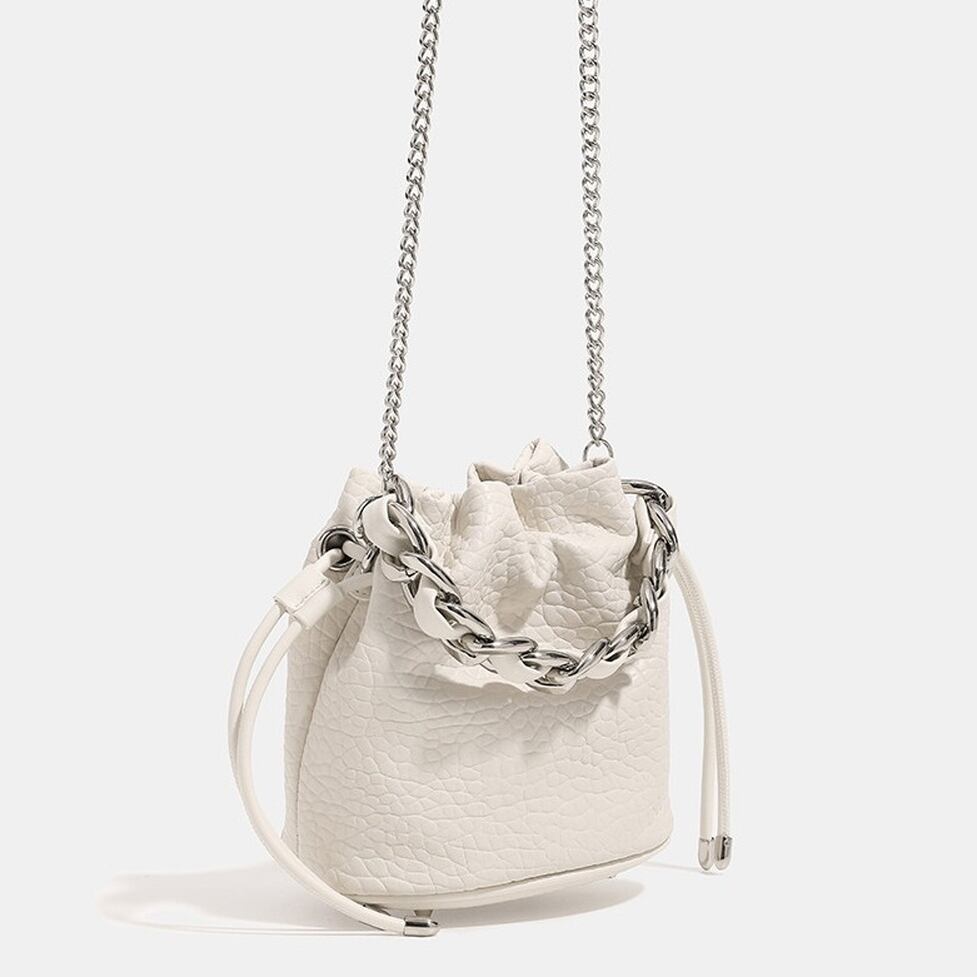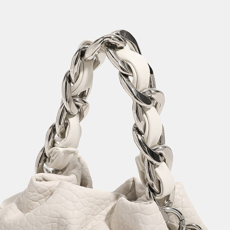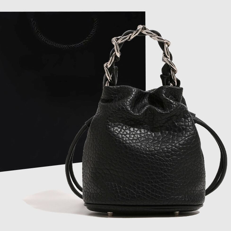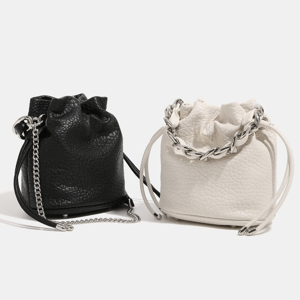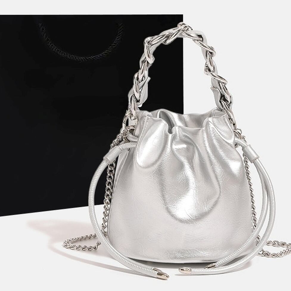 フェイクレザーと、シルバーチェーンのコントラストが際立つ巾着型バッグ。